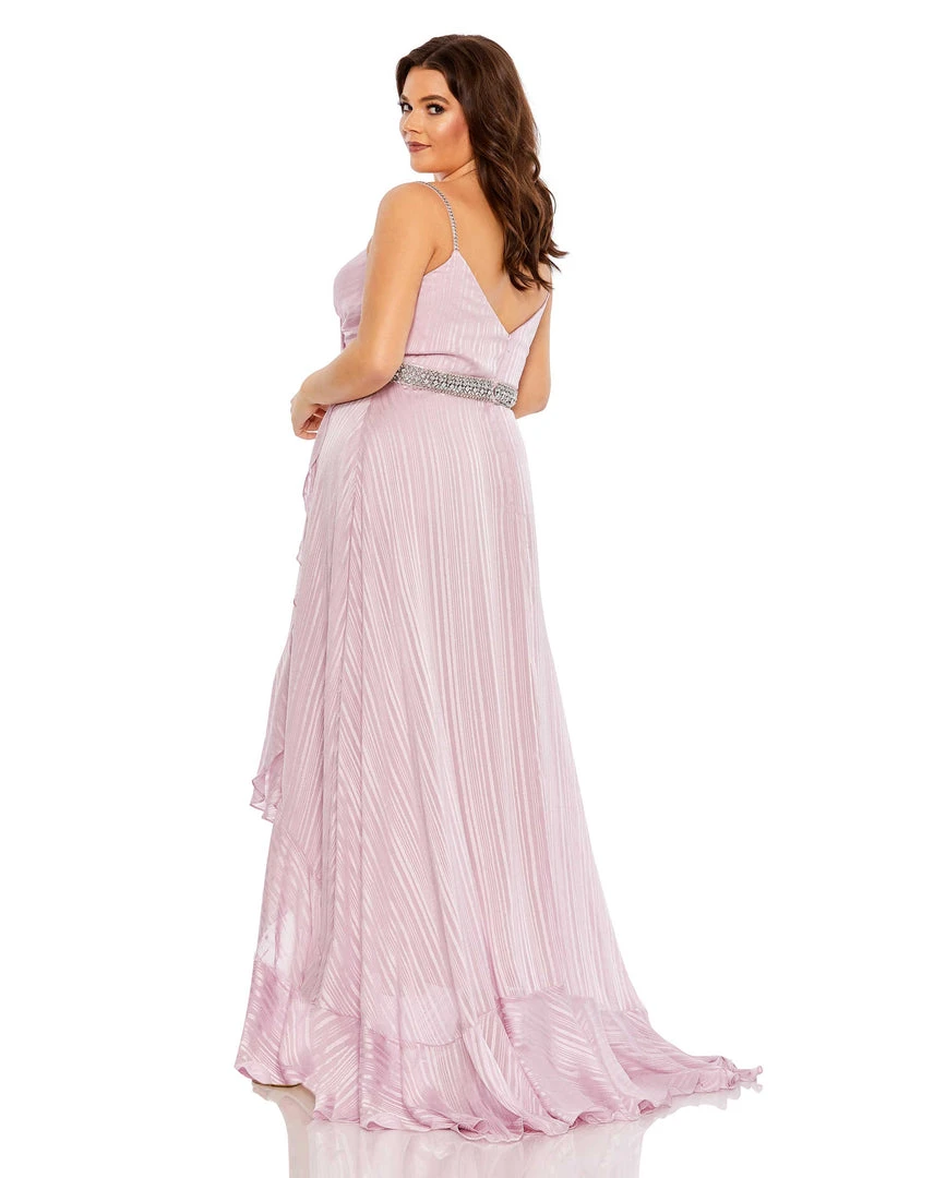 Mac Duggal Rhinestone Belt Faux Wrap Ruffle Tulip Hem Gown (Plus)
