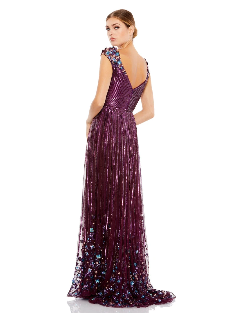 Floor-length evening gown cascading sequin stripes, exquisite 3D floral embellishments at the shoulders and bottom hem, and a sweeping A-line hem.
