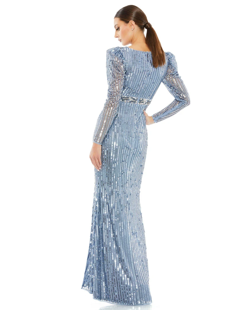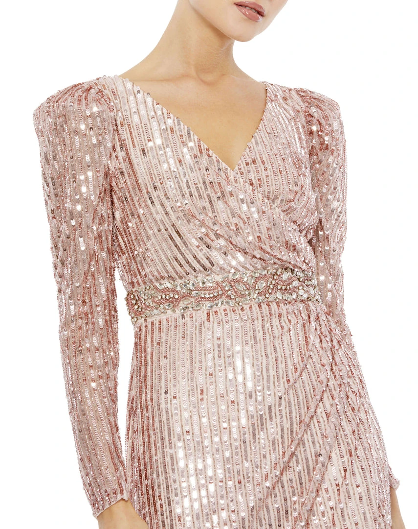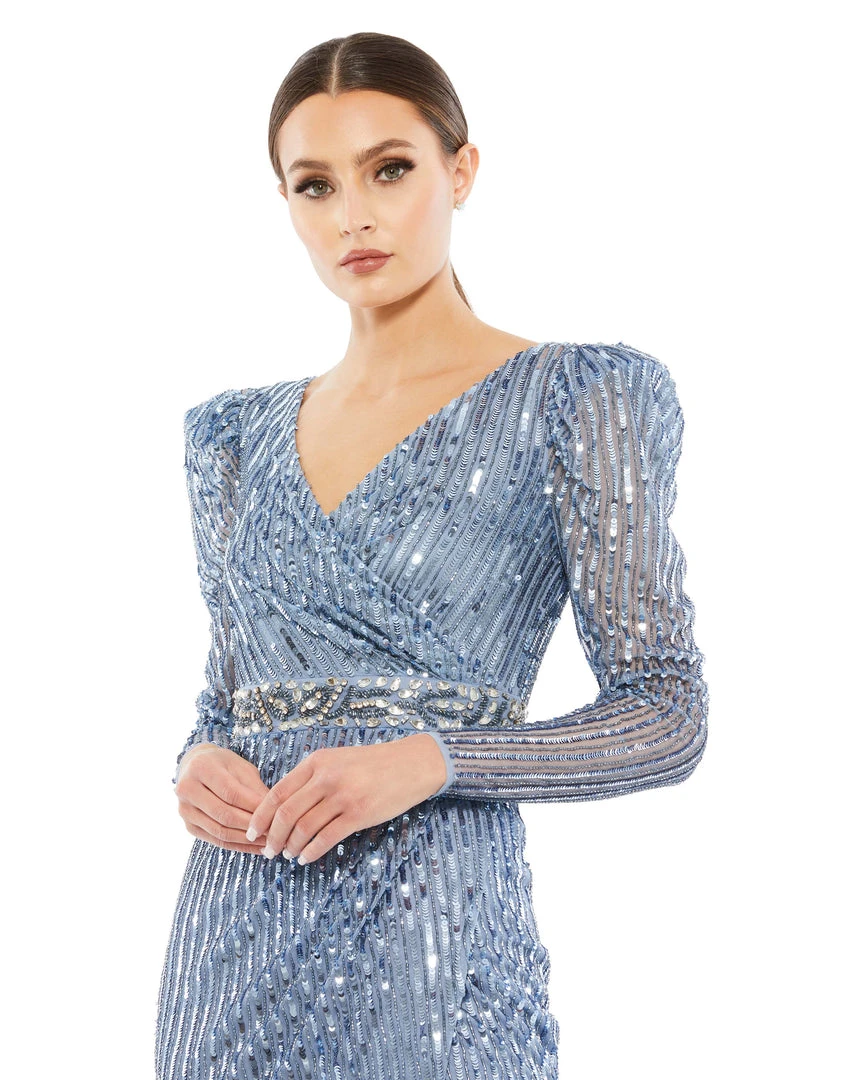 Embellished puff sleeve gown with sequins and rhinestones, a plunging faux-wrap neckline and a daring thigh-high slit