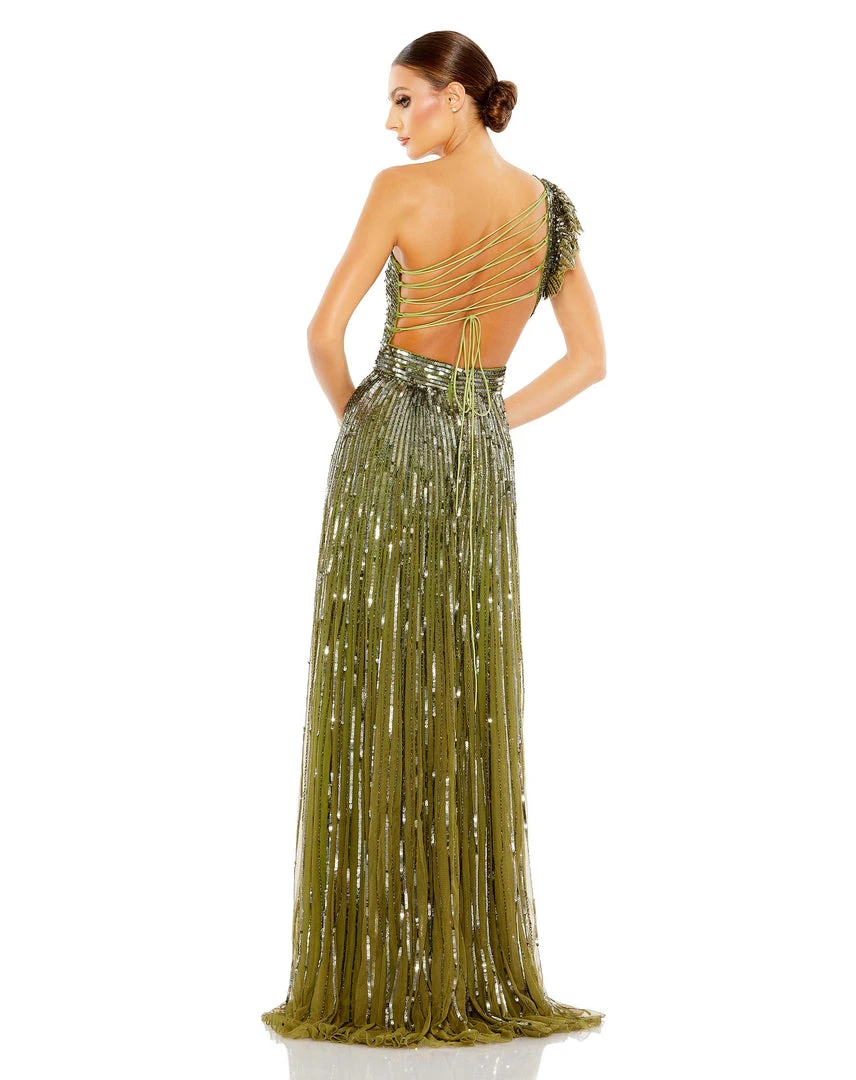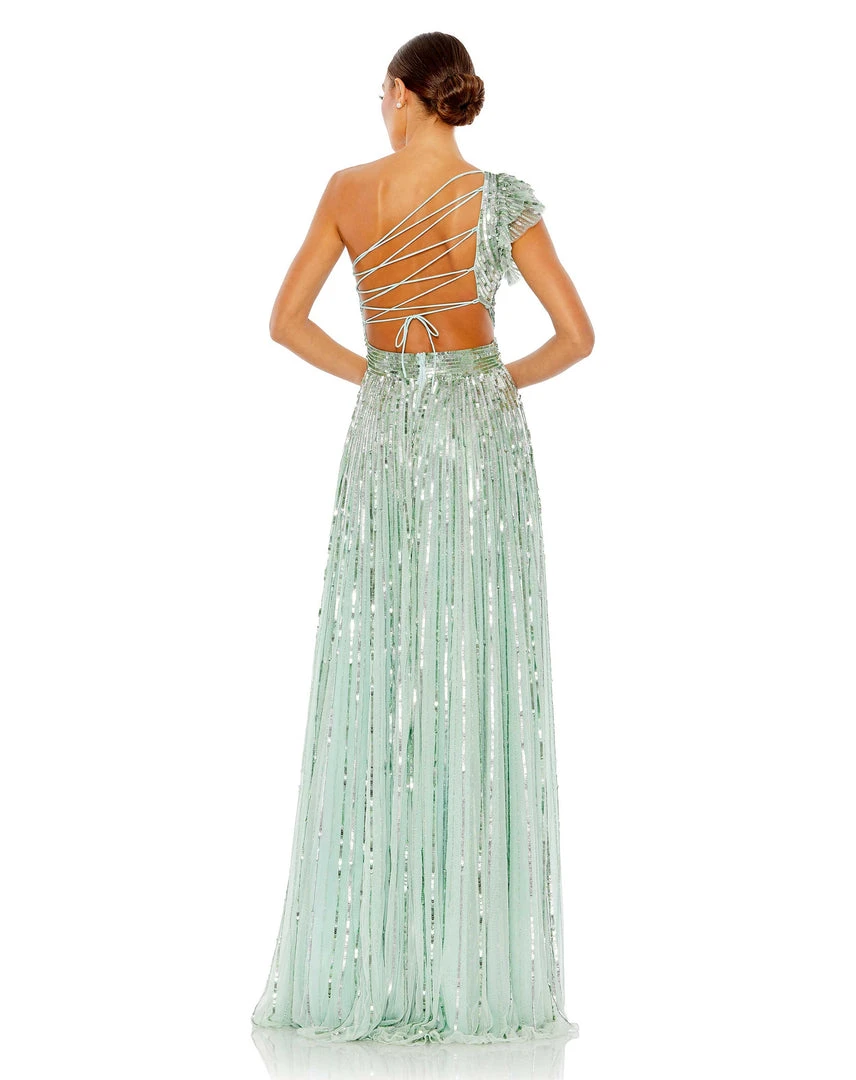 Mac Duggal Sequined One Shoulder Flutter Sleeve A Line Gown
