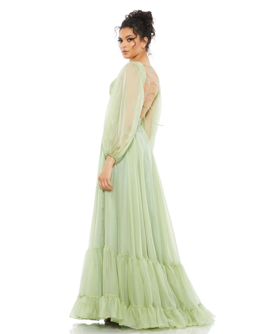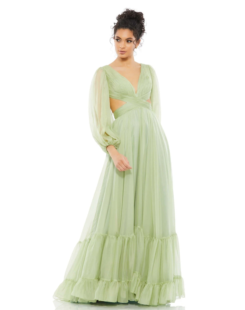 This ethereal maxi dress features a pleated bodice with a plunging v-neckline, sexy side cut-outs, and an exposed lace-up back. Sheer blouson sleeves are complimented by a flowy tiered floor-length skirt.