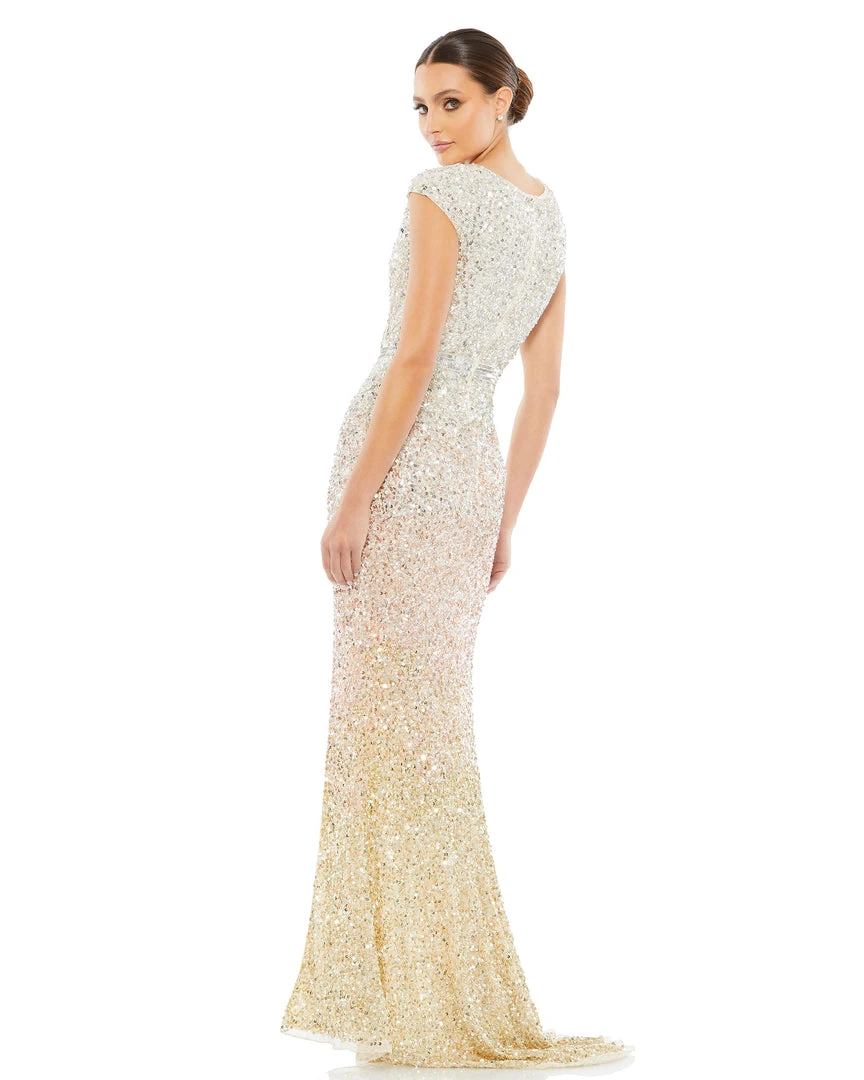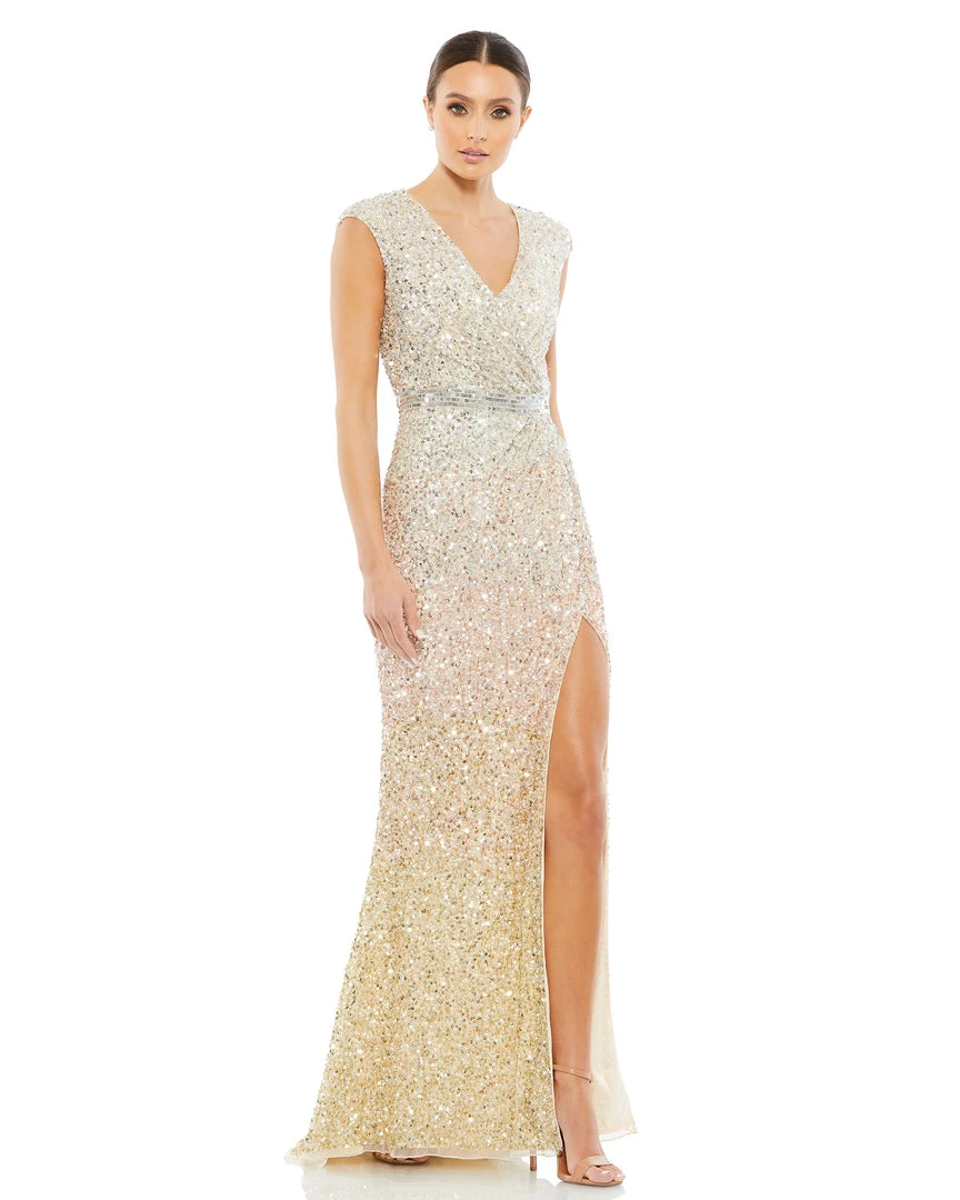 A show-stopping sequin gown belongs in every closet — and we’re partial to this magnificent ombré option. Covered from top to bottom in metallic sequins, this dress shines in so many ways. It’s designed with a V-neckline, cap sleeves, waist-whittling “belt” detail, and a thigh-high off-center slit.