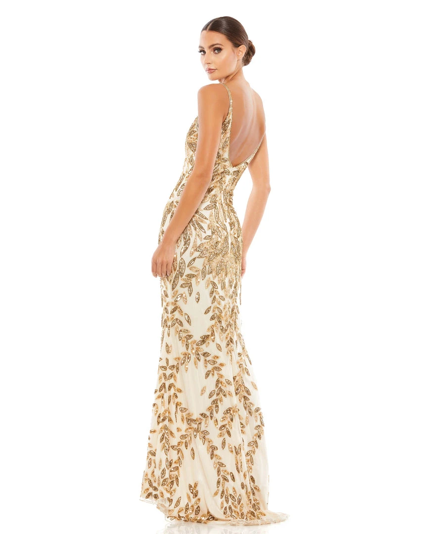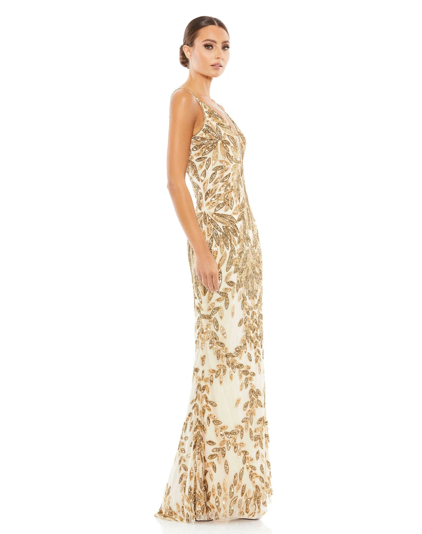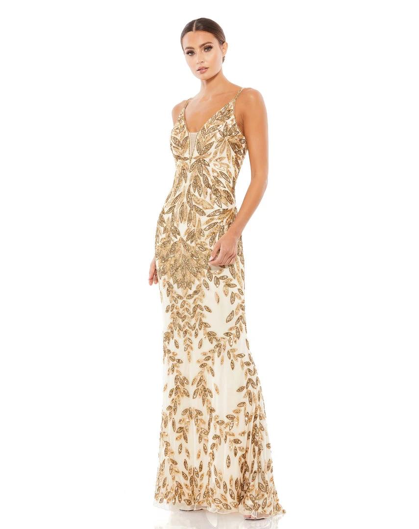 Stunning gown with allover leaf-patterned embellishment, a plunging illusion v-neckline, and an elegant train.