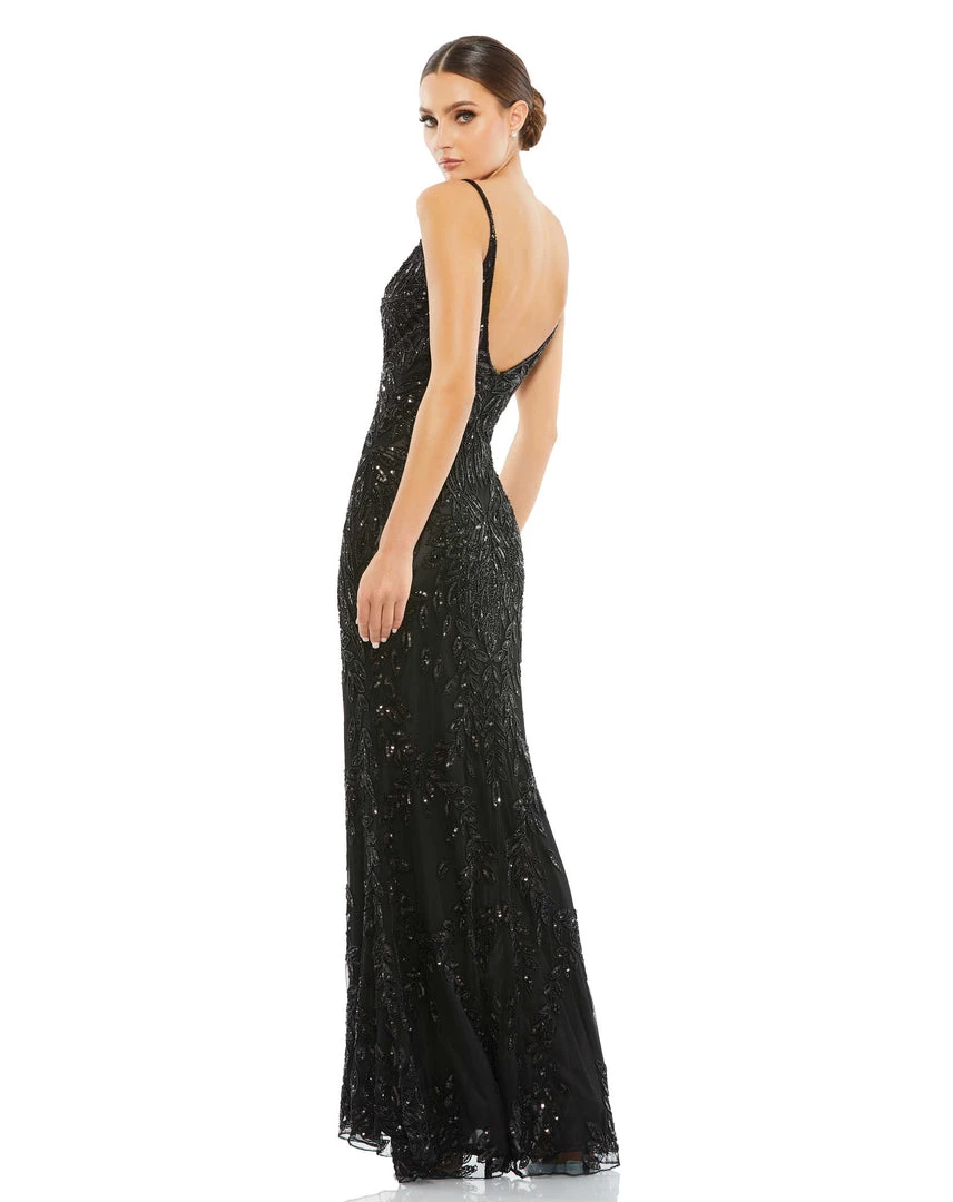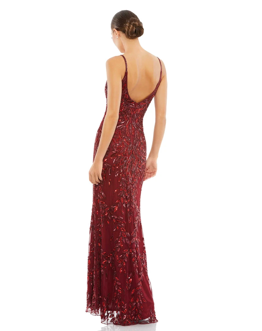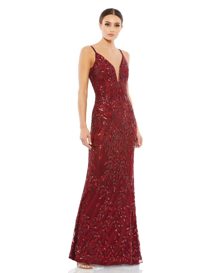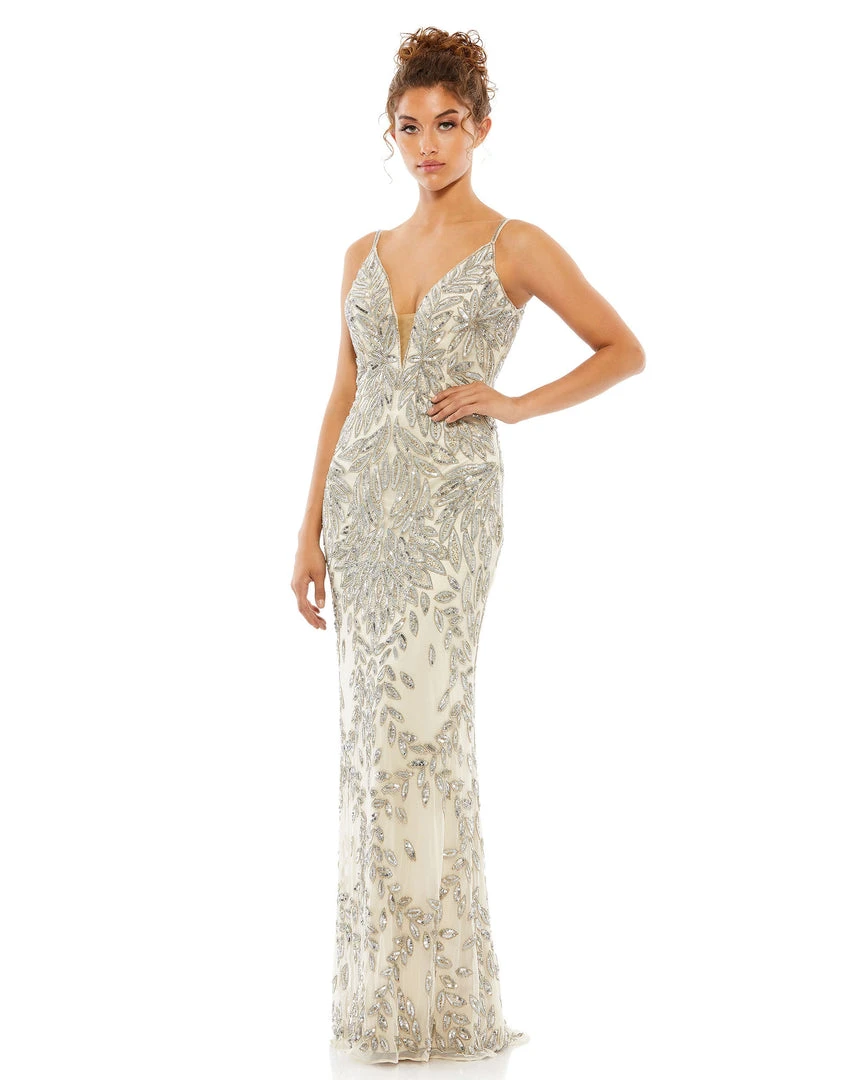 Stunning gown with allover leaf-patterned embellishment, a plunging illusion v-neckline, and an elegant train.