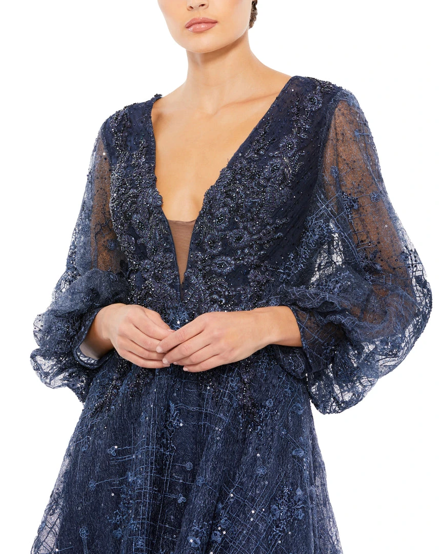 Mac Duggal Shop For Embellished Plunge Neck Puff Sleeve A-Line Gown