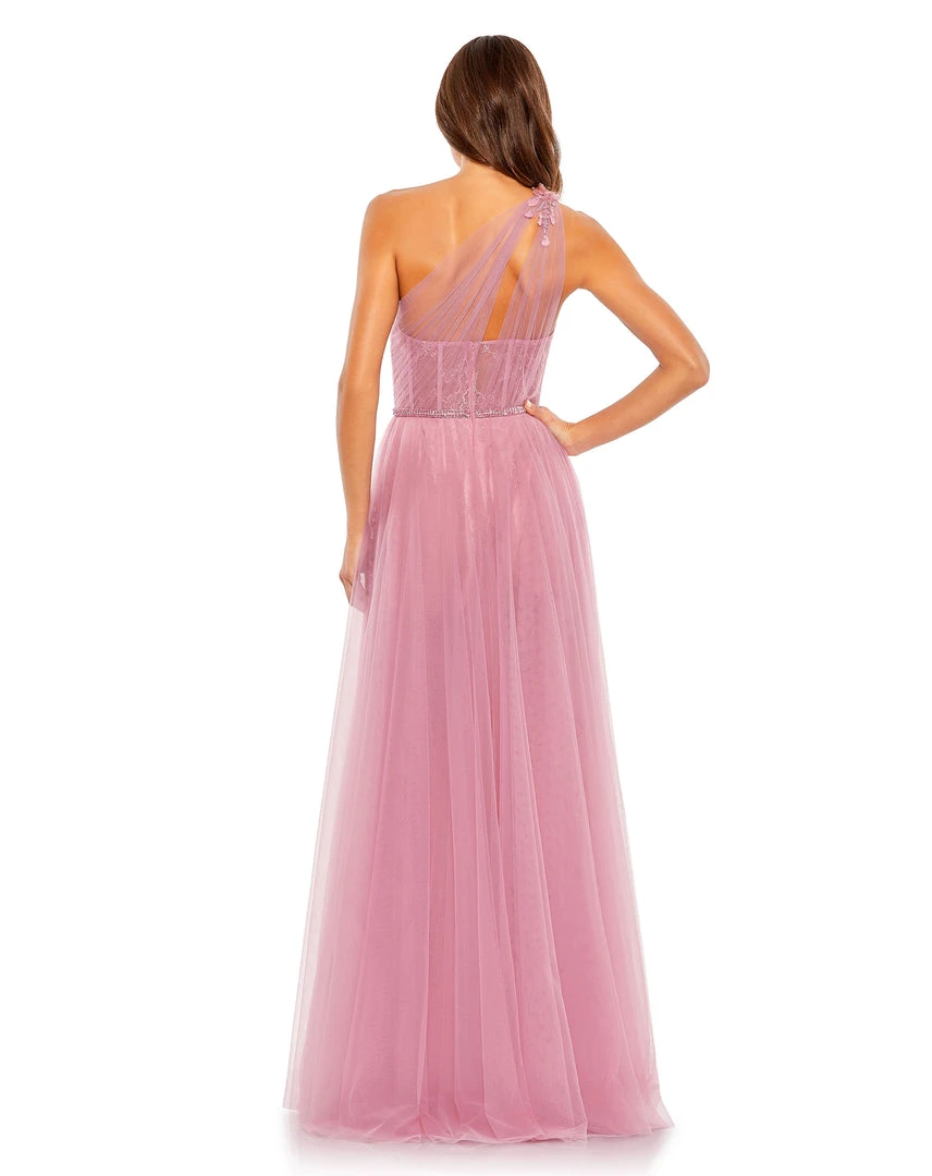 Make an entrance in a gown that rivals every other. This head-turning lace-and-tulle confection is the definition of perfection with a feminine silhouette and no shortage of romantic, luxe detail. Styled with a sheer neck and single shoulder, the dress reveals a corset-style bodice with contoured cups and boning, an attached beaded belt, and up-to-there slit. 3-D petals and glittering stem detail add beautiful touches to the waist and shoulder.