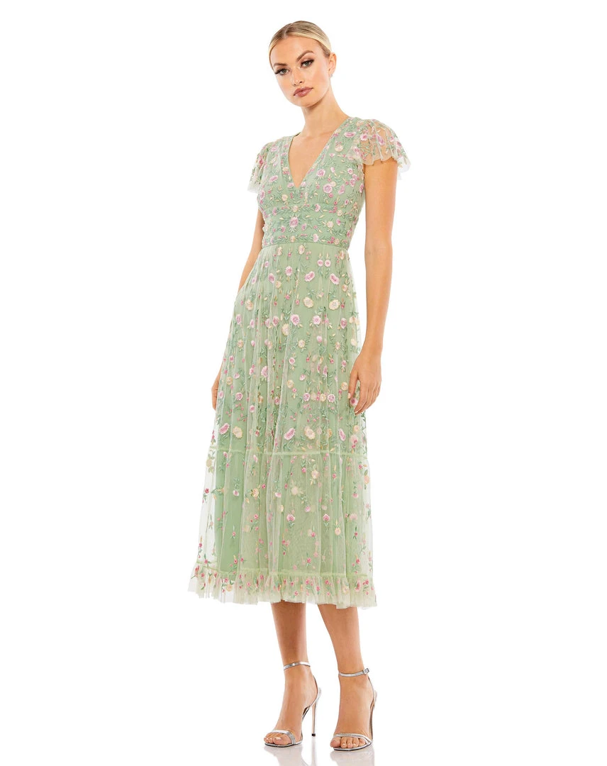 Mac Duggal Shop For Embroidered V Neck Cap Sleeve Midi Dress