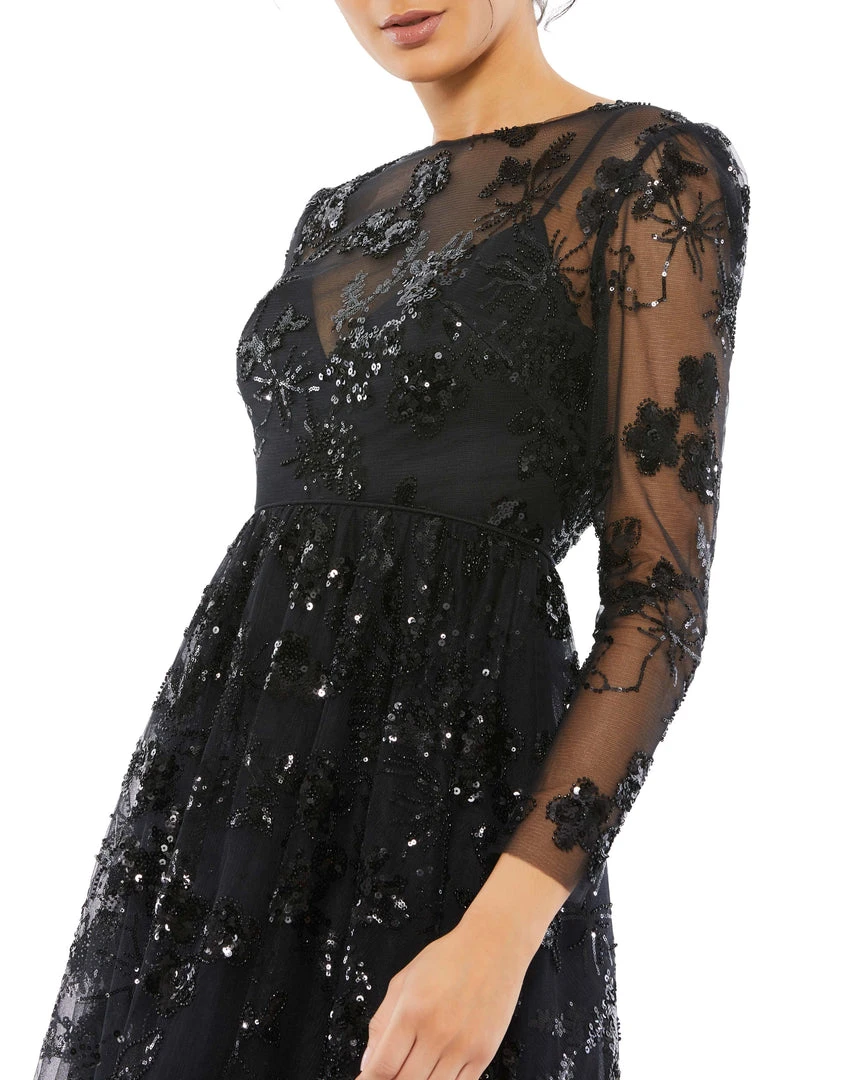 This dual-layer dress starts with a sleek slip and gets topped with the magic of sequin-embellished mesh. The beautiful dress showcases a sheer yoke and bracelet sleeves, a natural waist, and an A-line skirt that falls just past the knee. Let it light up a nighttime party.