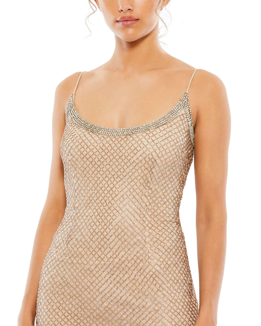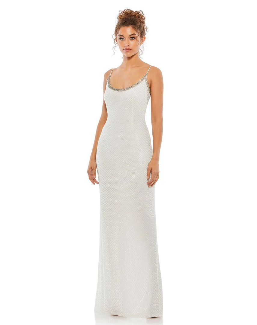 Stunning fully-beaded gown accented with a rhinestone-encrusted scoop neckline and subtle back slit.