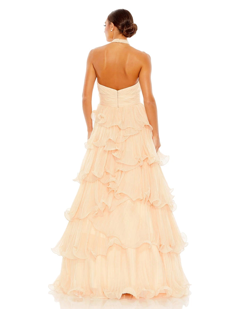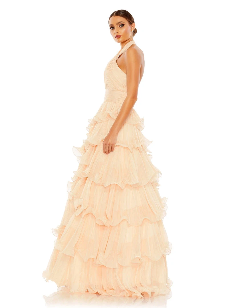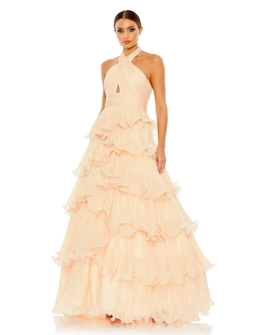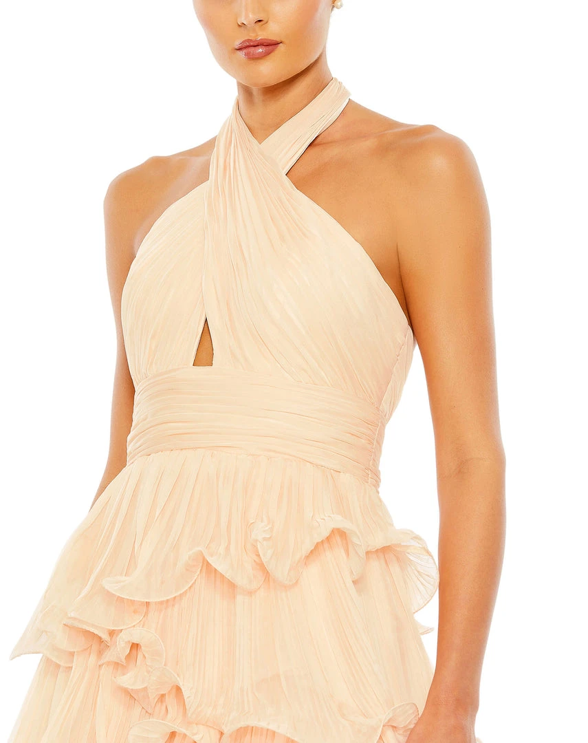 Mac Duggal Shop For Pleated Ruffle Tiered Cross Halter Neck Ballgown