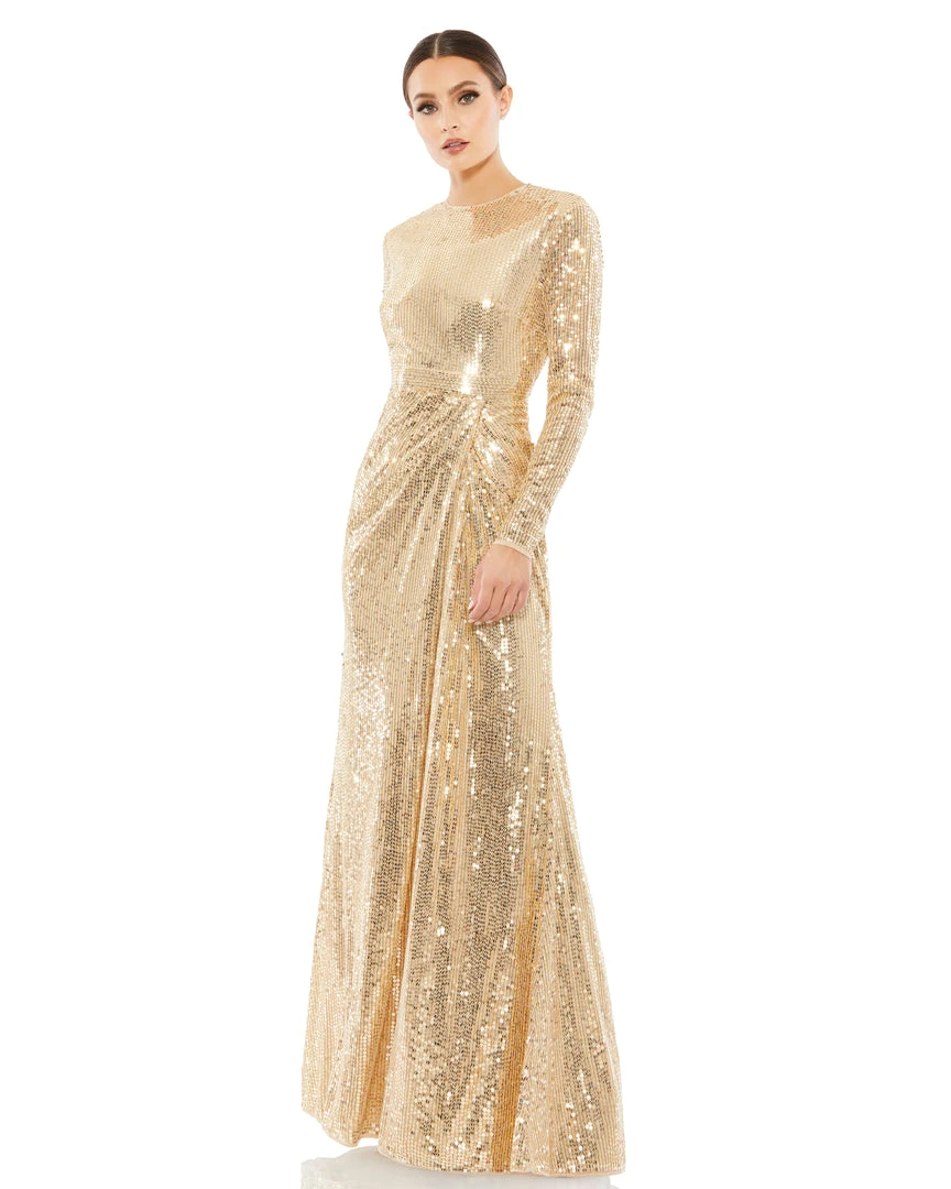 Bring on the shine! This hand-sequined gown is a fashion-forward choice for any formal affair. With a high round neckline, long sleeves, and a floor-grazing skirt, this modest silhouette is accented by a draped skirt and inset waist detail. Sleeves feature hidden zippers for ease of dressing.