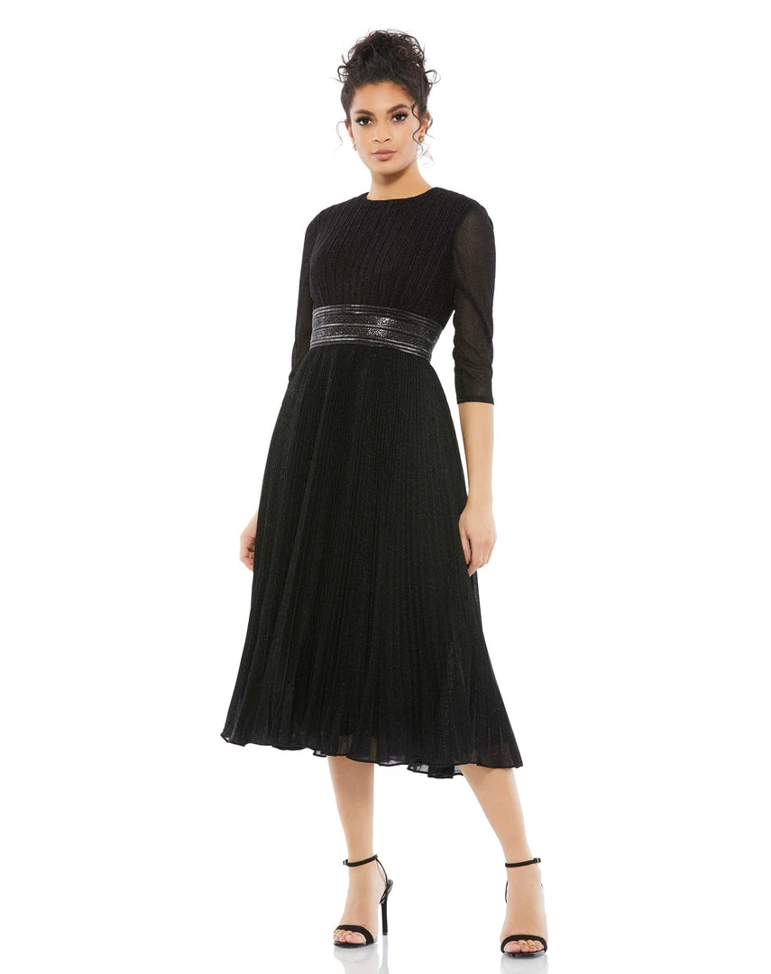 Elegant 3/4 sleeve dress with an a-line pleated tea-length skirt, round neckline, and a dramatic embellished waistband.