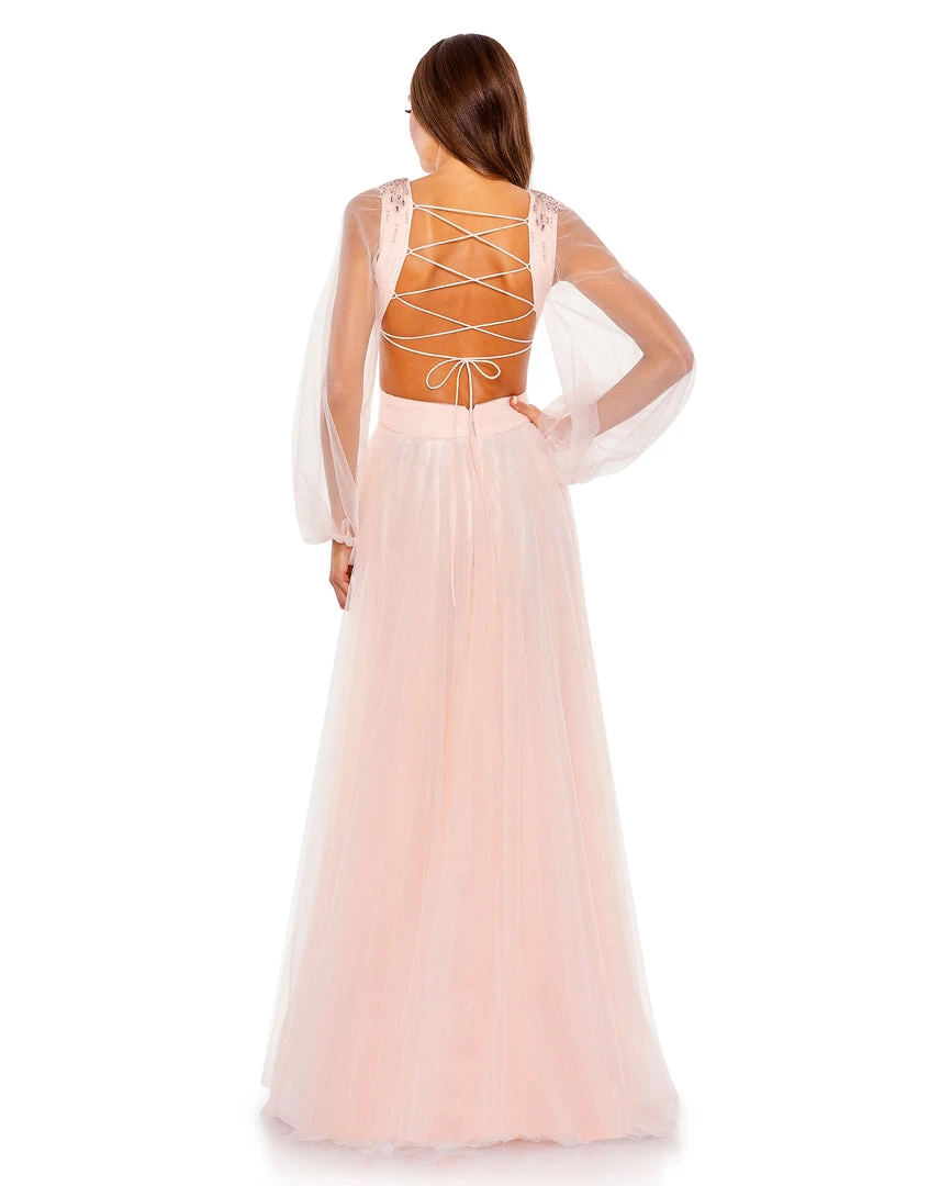 Made from light-as-air tulle and tonal floral lace, this gown is a princess dress dream come true. Cut in a timeless A-line silhouette with a plunging front, the dress is styled with sheer balloon sleeves, jeweled shoulders, a pleated, crisscross waist, and a skin-baring lace-up back.