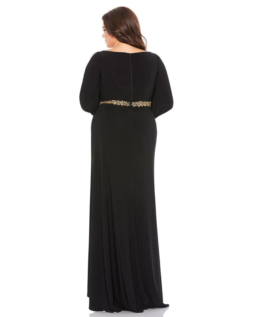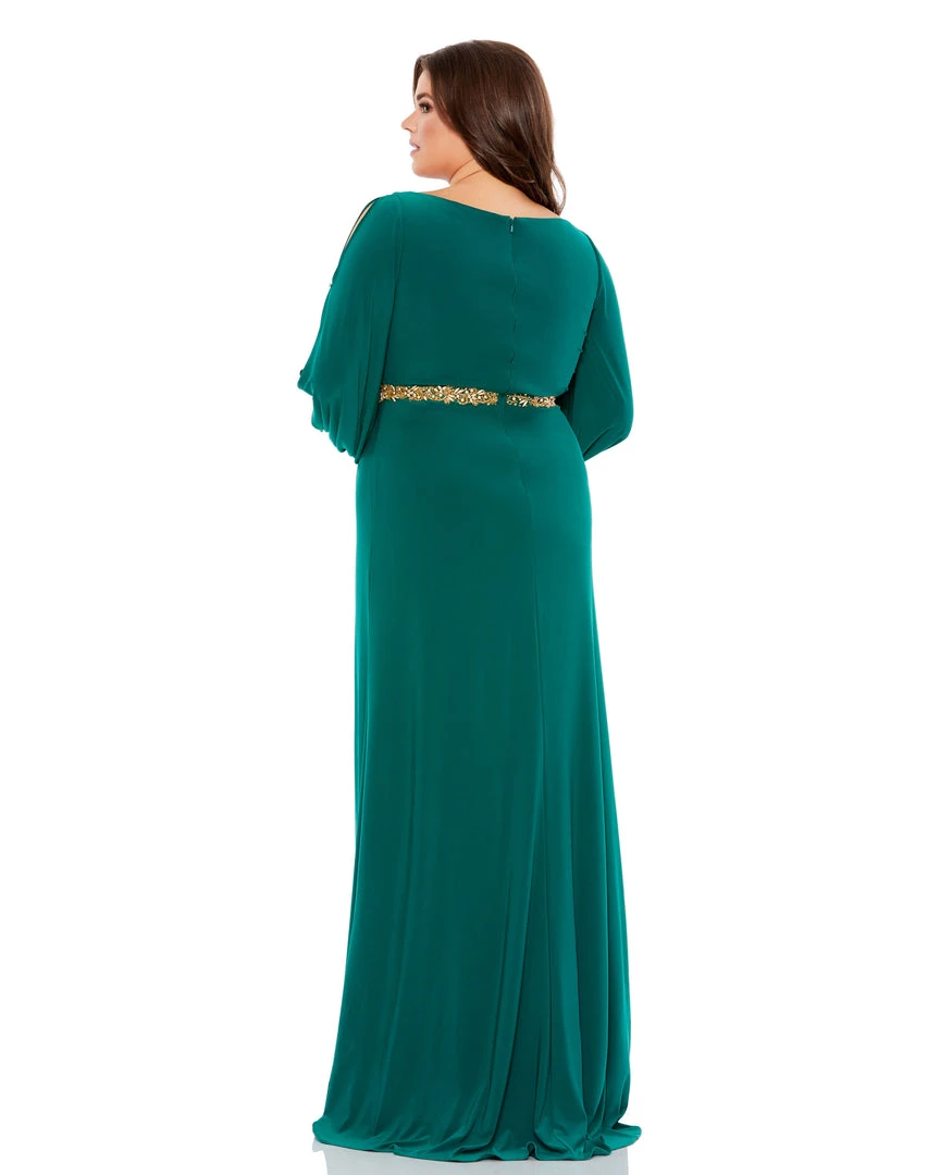 Elegant floor-length gown with a faux-wrap v-neckline, gathered waist, long split sleeves, and a thigh-high slit. A hand-embellished belt defines the natural waist.