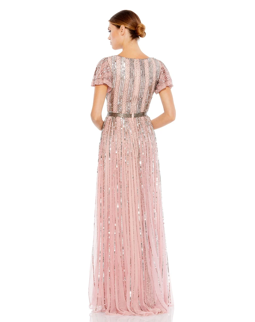 Elegant rose striped sequin gown with gunmetal beading throughout. Finished with bell ruffled sleeves and a hand-beaded belt.