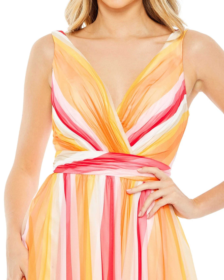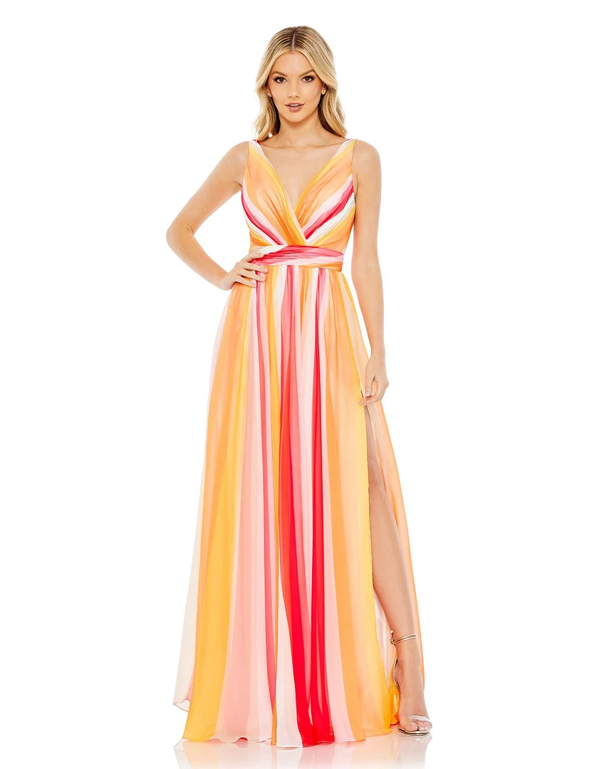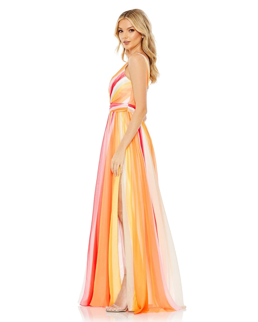 Perfect for prom, a summer wedding, or a formal soirée, this gown is crafted from chiffon punched up with sunrise-shaded streaks. Comfortable and effortless, the gown offers easy elegance with a surplice neckline, set-on waistband, and flowy A-line skirt finished with an off-center slit.