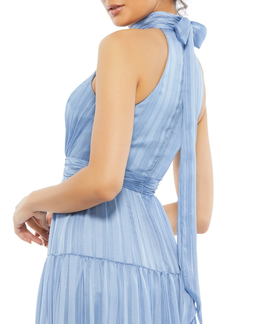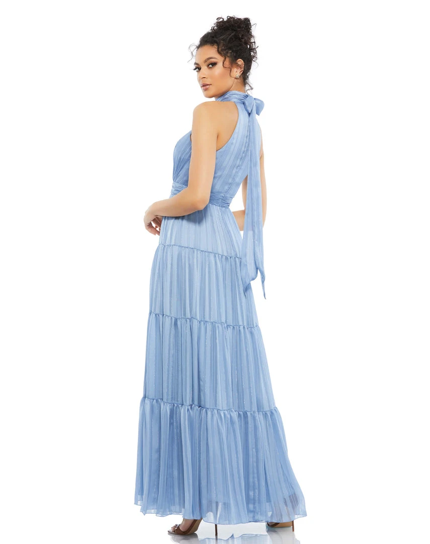 High neck halter gown features a pleated bodice, belted waist, and a tiered floor-length skirt.